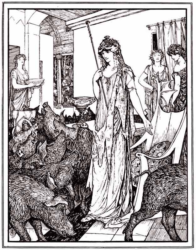 ヘンリー・フォード「魔女キルケーがオデュッセウスの一行を豚に変え、小屋へと追い立てる」(アンドルー・ラング『トロイとギリシャの物語』1907年 挿絵)